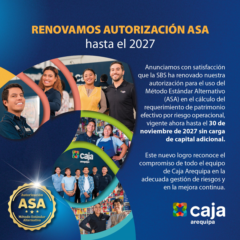 La Superintendencia de Banca, Seguros y AFP (SBS) renovó a Caja Arequipa la autorización para el uso del Método Estándar Alternativo (ASA) en el cálculo del requerimiento de patrimonio efectivo por riesgo operacional, esta vez hasta el 30 de noviembre de 2027.