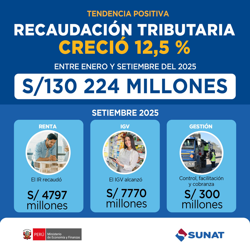 - Impuesto a la Renta: En setiembre se recaudaron S/ 4 797 millones por este concepto, importe que representó un crecimiento de 6,5% en comparación con el mismo mes del año 2024.
