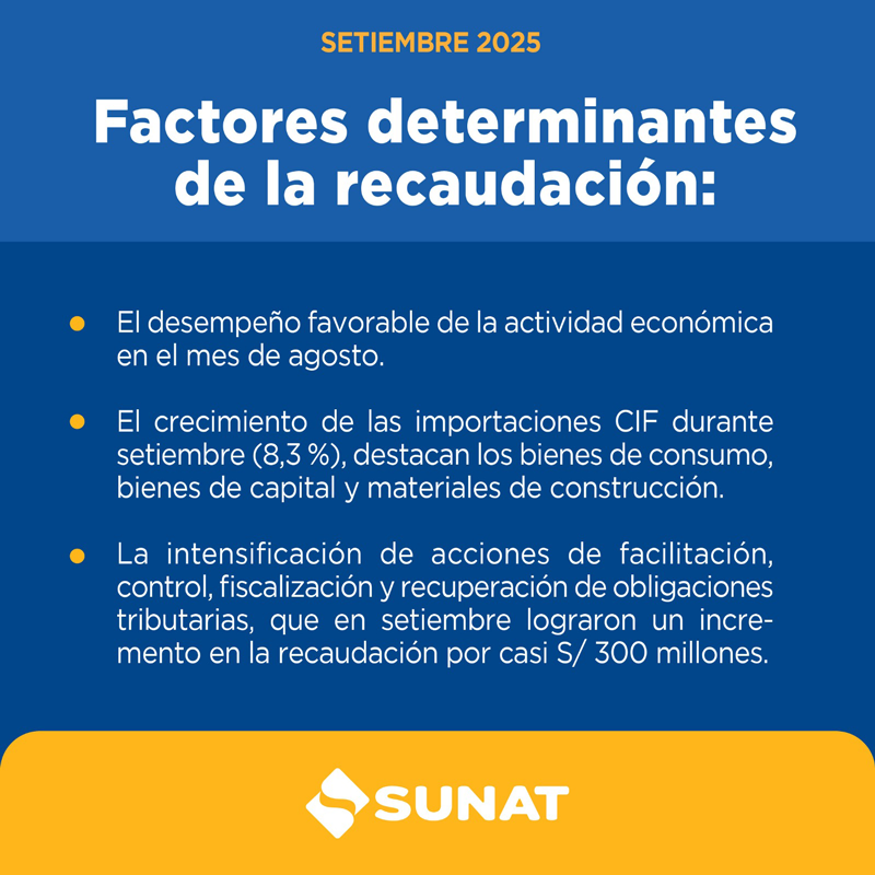 - Otros ingresos: La recaudación correspondiente a este rubro ascendió a S/ 1 697 millones, monto que representa un crecimiento de 23,6%, con respecto a lo obtenido en setiembre del año 2024.