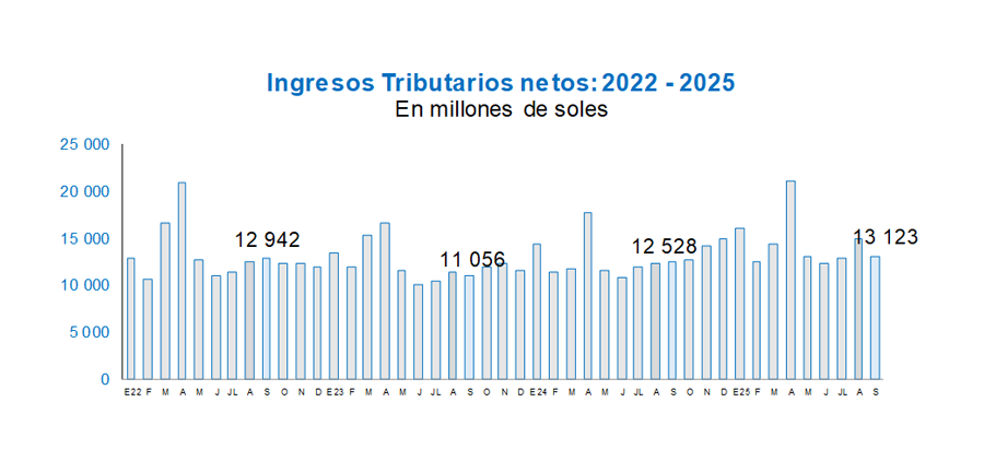En setiembre, los ingresos tributarios llegaron a S/ 13 123 millones. Con ello, la recaudación del mes experimentó un crecimiento de 3,3% con respecto al mismo mes del año 2024. Este resultado confirma la tendencia positiva en la evolución de los ingresos tributarios.