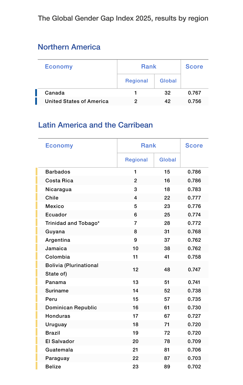 América Latina y el Caribe, con una puntuación de 74.5%, es la tercera región más igualitaria, superando a Perú en 1 punto porcentual. El país ocupa el puesto 15 de 23 economías regionales, por detrás de Barbados (0.786, puesto 15 global), Costa Rica (0.786, puesto 16), y Nicaragua (0.783, puesto 18). Mientras México y la República Dominicana registraron avances significativos (+10 y +21 puestos, respectivamente), Perú no logra mantener el ritmo de progreso regional, que ha cerrado 8.6 puntos porcentuales desde 2006.
