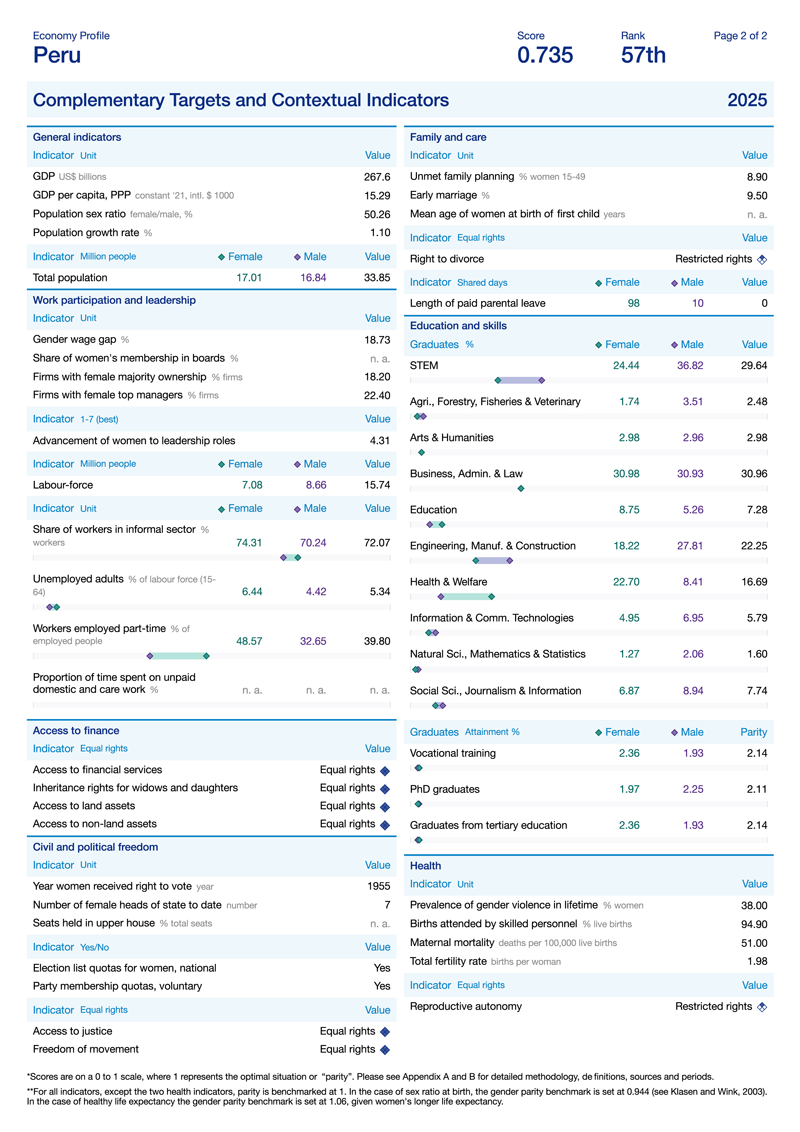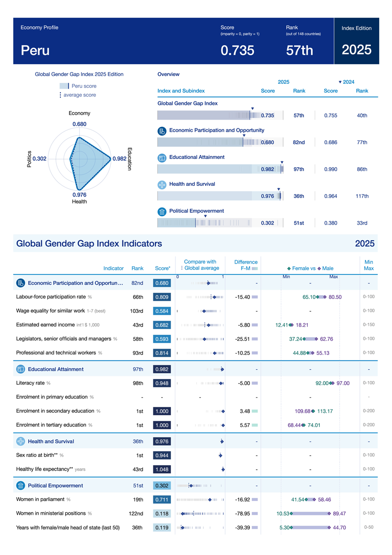 El Informe Global sobre la Brecha de Género 2025, publicado por el Foro Económico Mundial (WEF), revela un retroceso para Perú en su camino hacia la igualdad de género. Ubicado en el puesto 57 entre 148 economías, con una puntuación de 0.735 (73.5% de la brecha de género cerrada). Esto representa una caída de más de 2 puntos porcentuales respecto al 75.5% (0.755) de 2024.