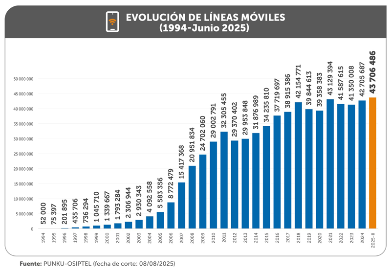 La competencia de las empresas operadoras y crecimiento de la demanda, dentro de un marco regulatorio inteligente, han permitido que el mercado móvil en Perú continúe expandiéndose y, al cierre del primer semestre de 2025, alcanzó la cifra histórica de 43.7 millones de líneas móviles activas, lo que representó un incremento de alrededor de un millón de líneas respecto al total registrado en diciembre de 2024 (42.7 millones), informó el Organismo Supervisor de Inversión Privada en Telecomunicaciones (OSIPTEL).